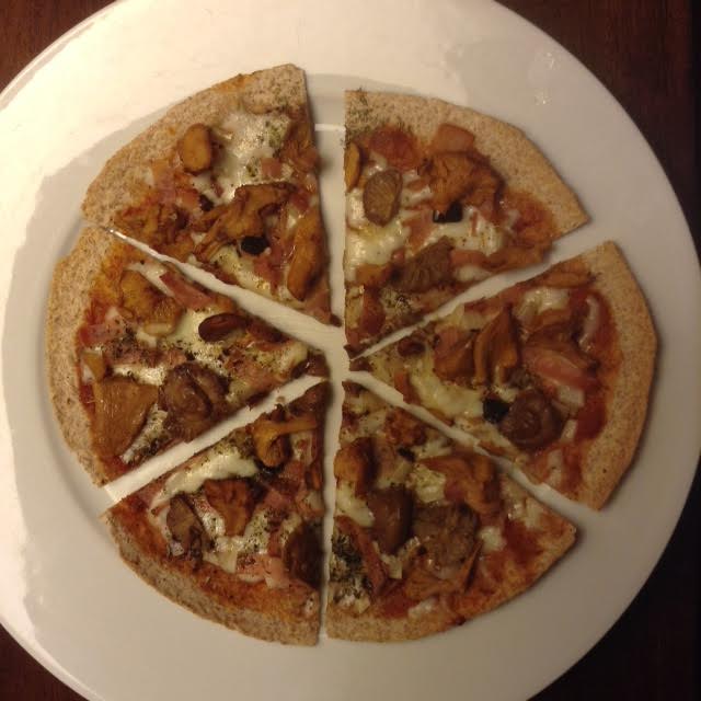 Winter Solstice Pizza: 283 calories 10 g fat 3 g fiber 16 g protein 16 g carbs 224 mg Calcium   PB  On the Winter Solstice, we like to prepare a pizza with elements of the season past [mushrooms and olives represent Fall] and of the season to come [cured meats stand in for Winter].
