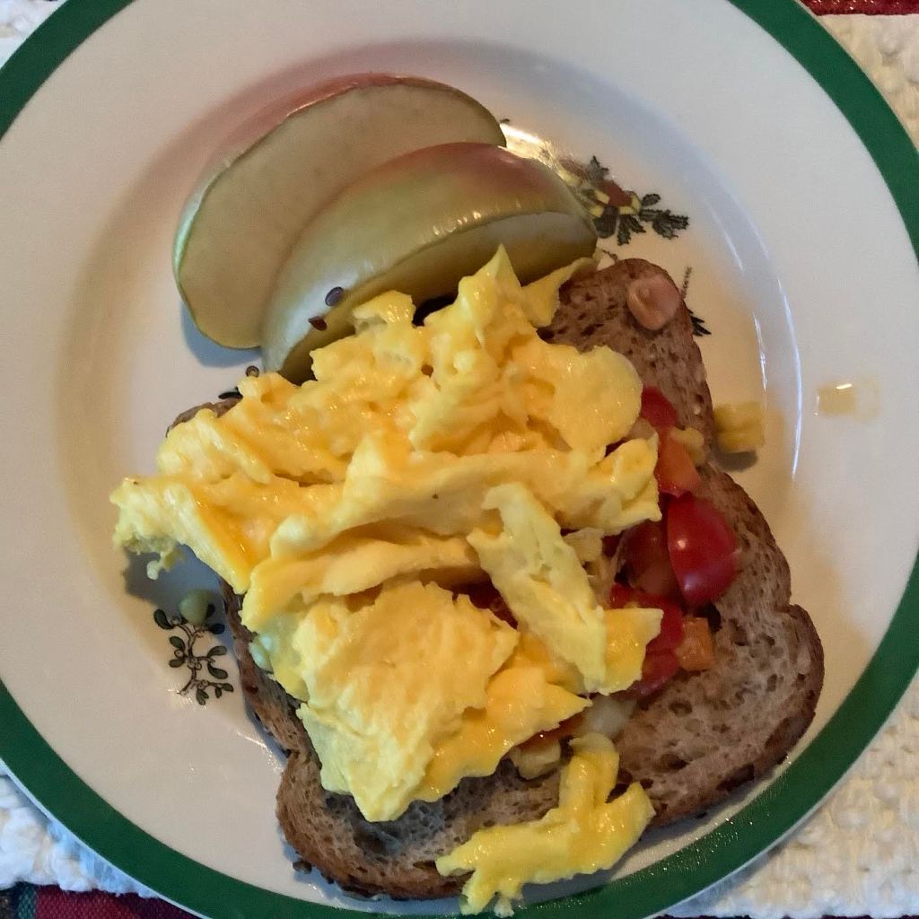 3 Tbsp Corn-Tomato Salsa** 1 slice 70-calorie whole grain bread [Dave’s Killer Bread is perfect] one 2-oz egg, fried or scrambled or hard-boiled 2 oz apple   Optional: blackish coffee [53 calories] or blackish tea or mocha cafe au lait [65 calories] or lemon in hot water
