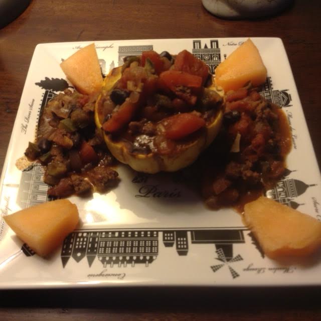 For tonight’s meal: 5 oz delicata squash, seeds removed 1 cup Bison Chili** or use Chili Non Carne  2 oz melon, as a garnish