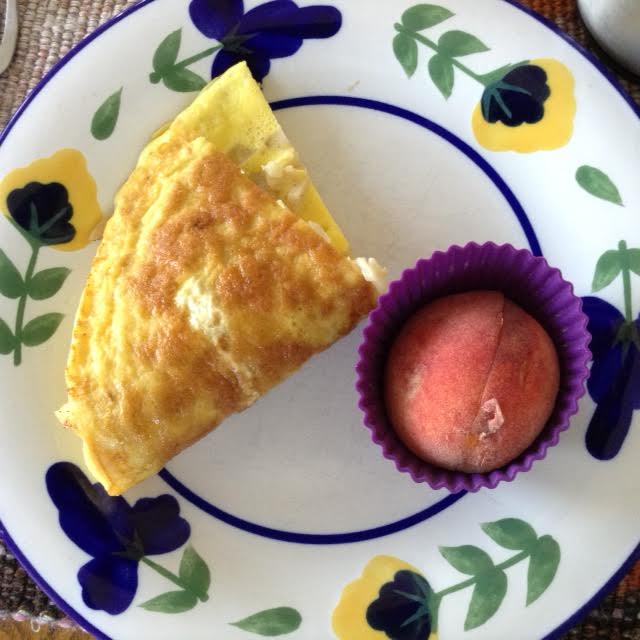 1½ eggs HINT: If you are serving one person, crack three 2-oz eggs into a small bowl or glass measuring cup. Whip up those eggs and pour half of their volume, into a jar with a lid and put it in the ‘fridge for next week. 1½ oz apple, peeled and sliced thinly 1½ tsp heavy/whipping cream ½ tsp butter ¼ tsp sugar ¼ tsp cinnamon 1 oz peach Optional: blackish coffee [53 calories] or blackish tea or mocha cafe au lait [65 calories] or lemon in hot water