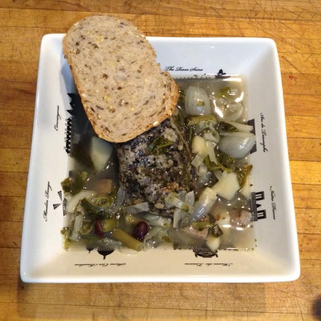 ½ pound granite or basalt stones, in large pieces – well scrubbed 2 quarts water 4 oz beef, diced 4 oz carrots, peeled and sliced 4 oz cabbage, sliced 4 oz parsnips, peeled and cubed 4 oz green beans, cut to 1” 4 oz red potato, diced 4 oz spinach, chopped 4 oz white beans lots of herbs + salt + pepper Optional: slice of artisinal rye bread adds 100 calories