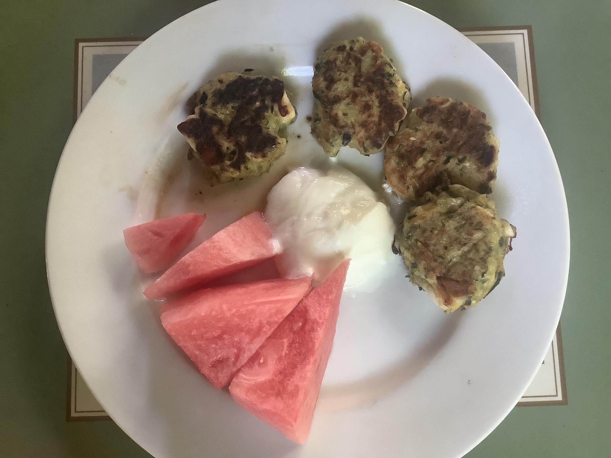 ++ 4 zucchini-feta fritters ** ++++ 3 oz watermelon ++++ 2 Tbsp plain, fat-free yogurt ++++ Optional: 5 oz fruit smoothie or berry-yogurt smoothie [88 calories] ++++ Optional: blackish coffee [53 calories] or blackish tea or mocha cafe au lait [65 calories] ++