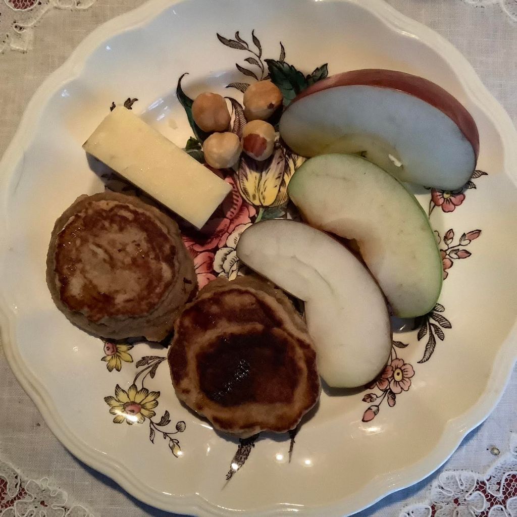 2 barley cakes** 2 oz apple or pear ½ oz Cheddar cheese 5 hazelnuts or almonds Optional:blackish coffee [53 calories] or blackish tea or mocha cafe au lait [65 calories] or lemon in hot water