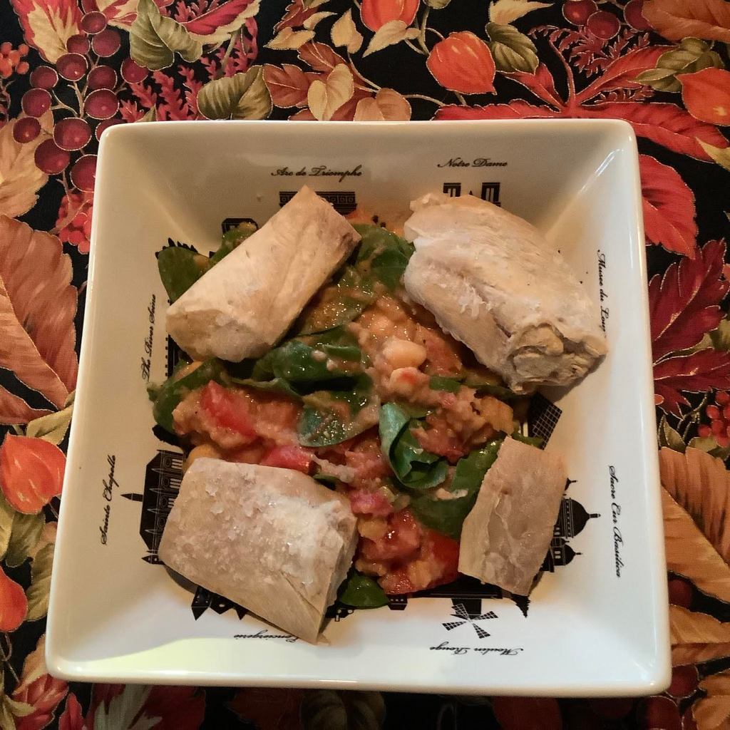 Heat the oil in a saute pan. Add the onion, scallion and garlic. Stir briefly over the heat then add the tomatoes, chickpeas, salt, and pepper. Cook over low heat until liquids are mostly evaporated, adding the spinach at the end so it wilts. If using now, separate out your portion and keep warm. Cool the remaining ragout and freeze it in serving portions. Add one of the following meats. >3 oz chicken breast [if cooked, mix in with the ragout to warm the meat] [if meat is raw, add to the pan along with the tomatoes and chickpeas] >>3 oz pork tenderloin [if cooked, mix in with the ragout to warm the meat] [if meat is raw, add to the pan along with the tomatoes and chickpeas] >>>2 oz lean beef pieces, not ground beef [if cooked, mix in with the ragout to warm the meat] [if meat is raw, add to the pan along with the tomatoes and chickpeas]