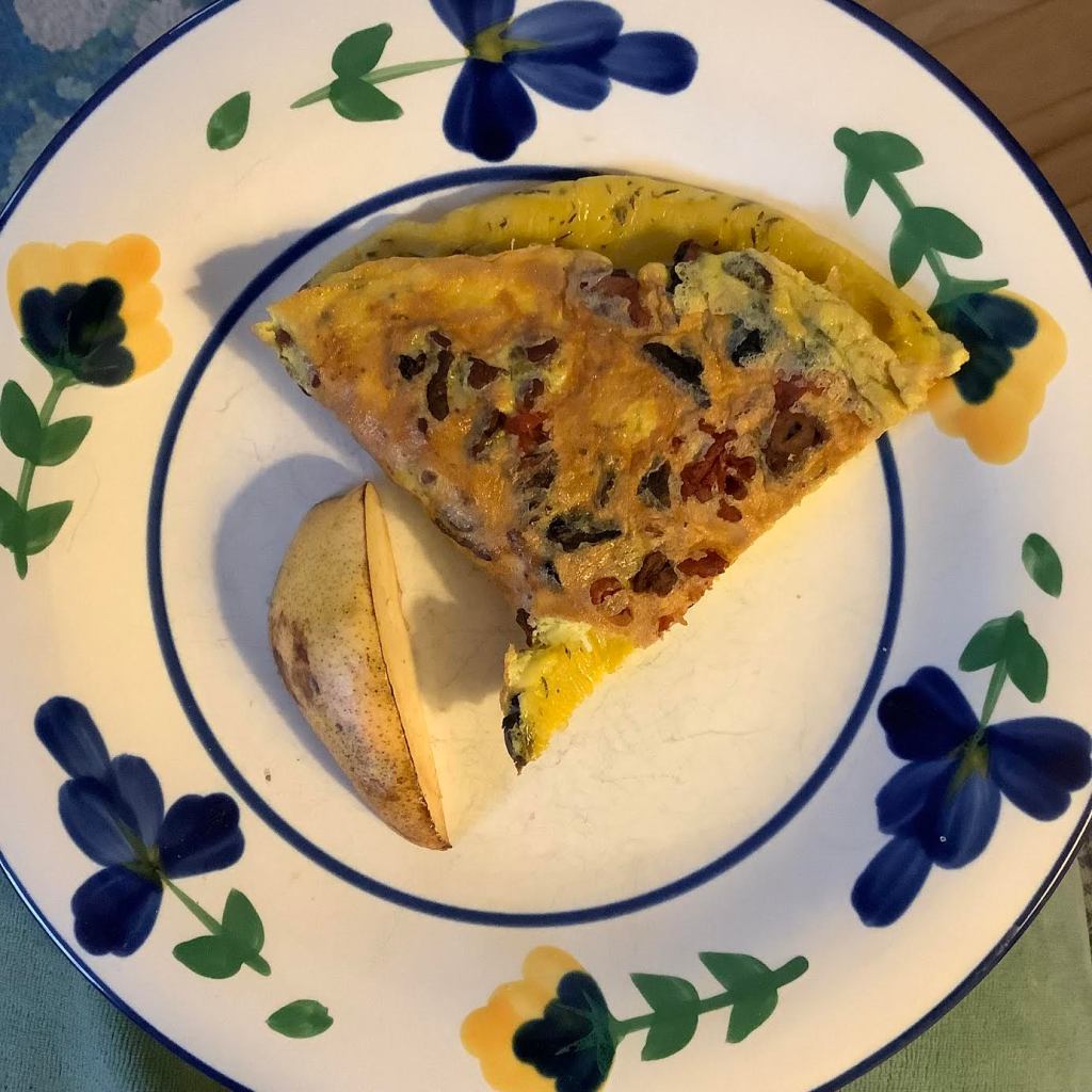 1½ two-oz eggs  HINT: If you are serving one person, crack three 2-oz eggs into a small bowl or glass measuring cup. Whip up those eggs and pour half of their volume into a jar with a lid and put it in the ‘fridge for next week.   ¼ oz prosciutto ½ oz mushrooms ¾ oz pear   Optional: blackish coffee [53 calories] or blackish tea or mocha cafe au lait [65 calories] or lemon in hot water  Optional: 5 oz fruit smoothie or berry-yogurt smoothie [88 calories]