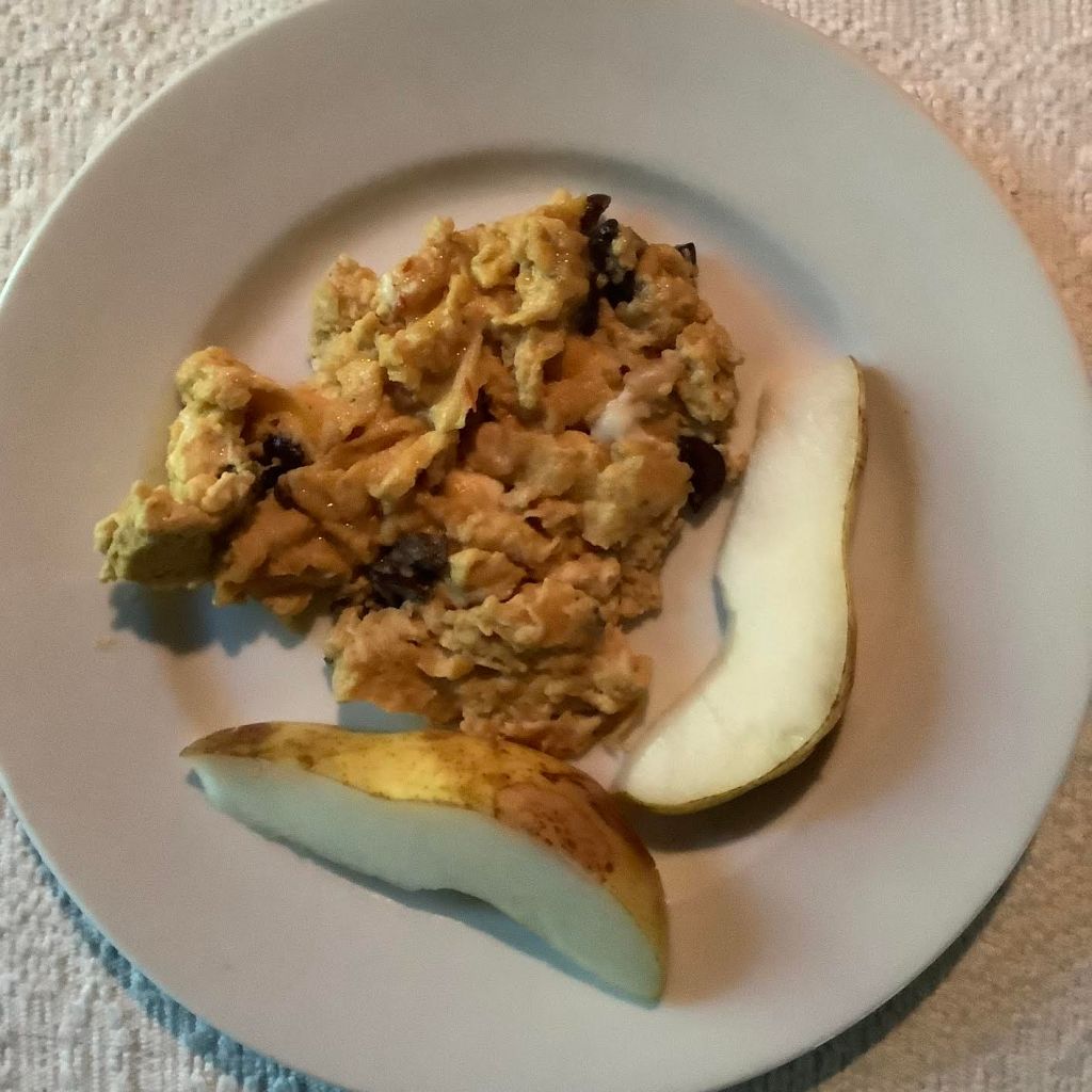 1½ two-oz eggs HINT: If you are serving one person, crack three 2-oz eggs into a small bowl or glass measuring cup. Whip up those eggs and pour half of their volume into a jar with a lid and put it in the ‘fridge for next week. ½ oz mushrooms, chopped 1½ oz tomatoes, cubed/diced, drained 1 Tbsp scallion, chopped 2 oz peach or plum or pear Optional:blackish coffee [53 calories] or blackish tea or mocha cafe au lait [65 calories] or lemon in hot water Optional: 5 oz fruit smoothie or berry-yogurt smoothie [88 calories]