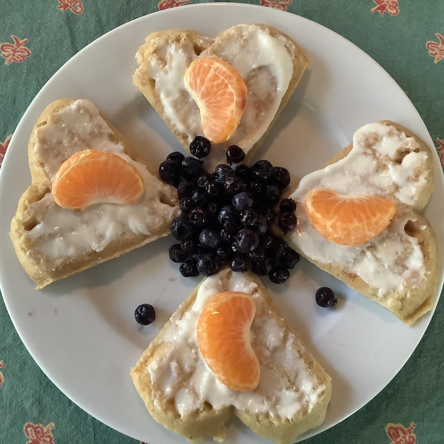 4 waffle hearts, each 2×3″ 2 Tbsp vanilla fat-free yogurt 1 Tbsp almond meal 4 sections of Clementine 1 oz blueberries Optional: 5 oz fruit smoothie or berry-yogurt smoothie [88 calories] Optional:blackish coffee [53 calories] or blackish tea or mocha cafe au lait [65 calories]