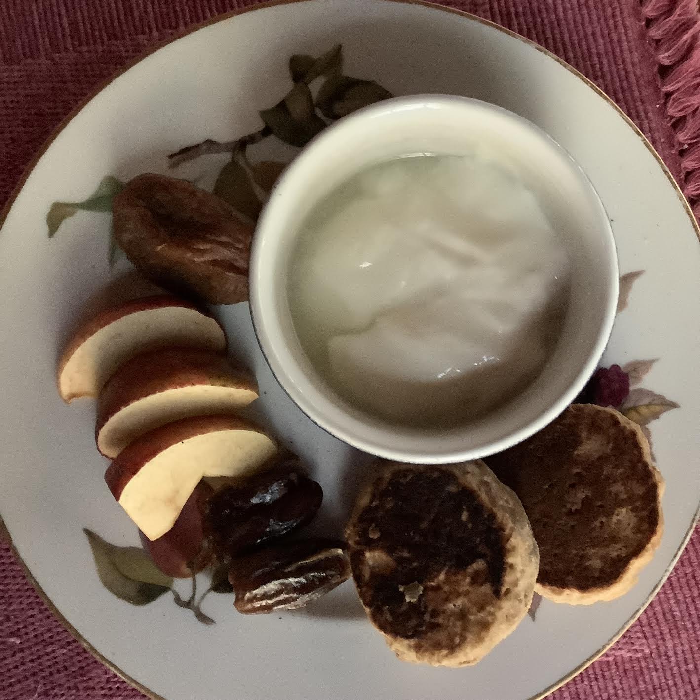 2 Barley Cakes** ½ oz dried Turkish fig ½ oz grapes or 1 oz melon 2 deglet noor dates ½ cup plain, fat-free yogurt   Optional: blackish coffee [53 calories] or blackish tea or mocha cafe au lait [65 calories]