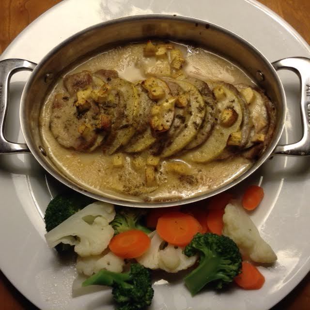Poach the apple slices in the stock until they are tender. TIP: if cooking for 2, this may require poaching in 2 batches. Remove slices and reserve. Slice th pork into rounds about 1/4” thick.  If pork is raw, braise it briefly in the hot stock, and remove from stock. Put 1 Tbsp stock in the oven-proof pan in which you will cook the dinner. Combine diced apples, Bechamel, seasonings, and remaining stock in the sauce pan, stirring until apples are soft and sauce is medium-thick. Adjust seasonings. Arrange alternating slices of pork and apple in the baking pan. Nap with the sauce and bake at 350 until warmed through, about 20 minutes. Steam the vegetables and enjoy a hearty winter meal.