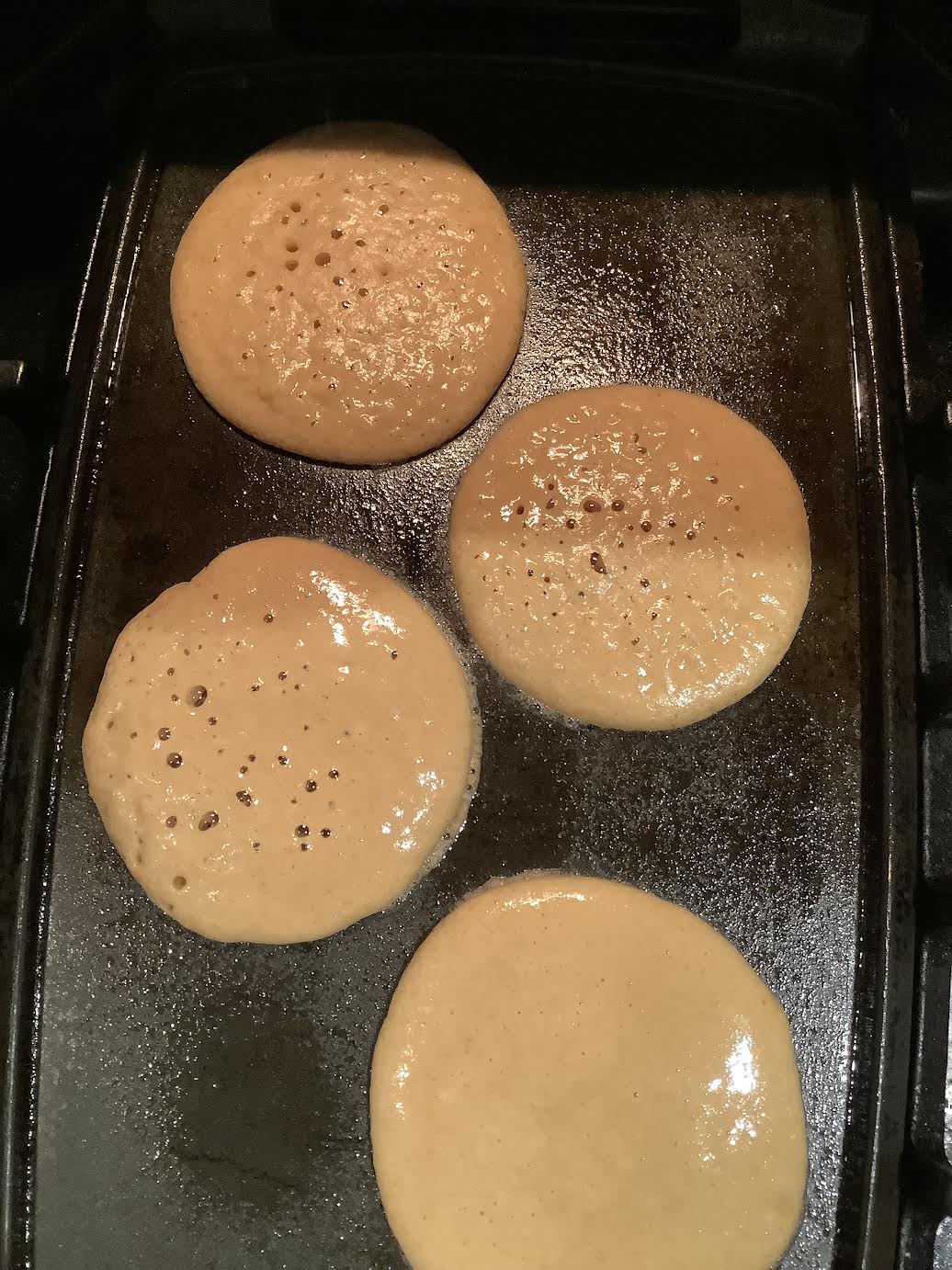 | When bubbles appear on top of the pancakes, flip, and cook until browned on the other side. |