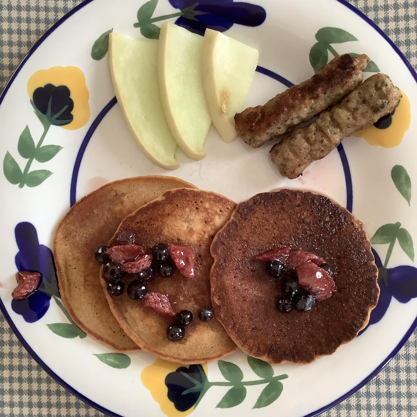 I prepared enough pancakes for two people, then used a little waffle iron to make four 3×3″ waffles for another breakfast.