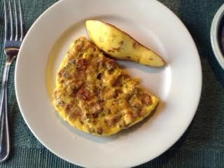 1 two-oz egg ½ oz turkey breast, raw or cooked, diced finely 0.75 oz prepared turkey stuffing —OR— ¼ slice of 70-calorie whole-grain bread [¼ oz] + 1-2 Tbsp onions + 1-2 Tbsp celery lots of rosemary + thyme + sage + salt + pepper 1 oz pear Optional: blackish coffee [53 calories] or blackish tea or mocha cafe au lait [65 calories]  Optional: 5-6 oz fruit smoothie or berry-yogurt smoothie [88 calories]