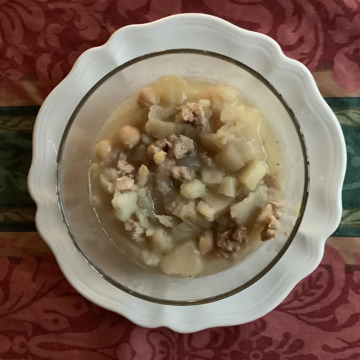 8 ounces mild Italian sausage meat 1½ cups onions, sliced 6 scallions, cut into ½-inch pieces (1¼ cups) 6 cups water 1 cup canned chickpeas 16 oz potatoes, peeled and cut into ½” chunks — try using half sweet potatoes 8 ounces savoy or other green cabbage, chopped/sliced 1¼ teaspoons salt