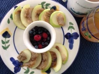 Slice the fish with the grain to create thin slices. Arrange the fish and apples in overlapping slices around the plate. HINT: I did this the night before, covered it with clingwrap and put it in the ‘fridge. So quick the next morning!! Brew your hot beverage, blend or shake your smoothie, dish out those healthy blueberries, and breakfast elegantly.