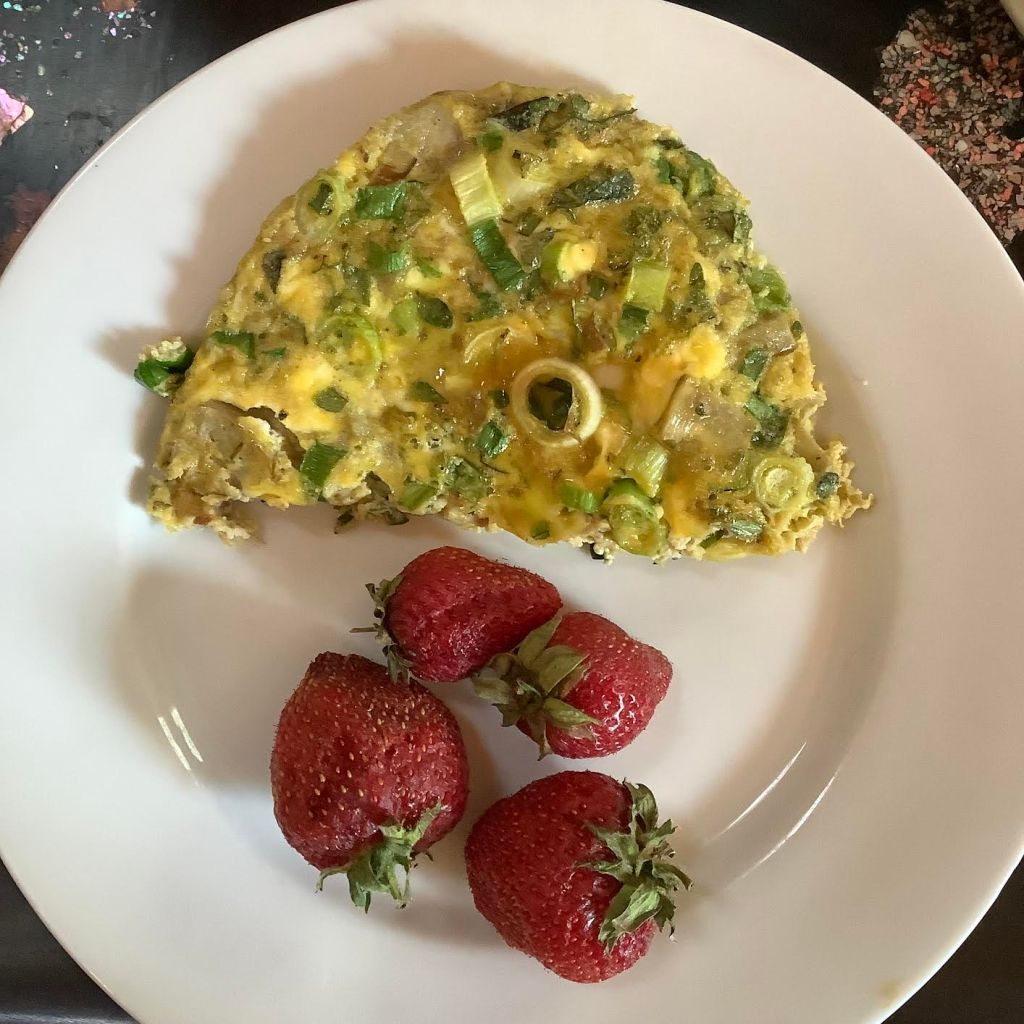 1 two-oz egg  ¼ oz scallion, sliced across   2 tsp chopped mixed fresh herbs          ½ oz artichoke hearts, canned in water, chopped  1 Tbsp reduced fat ricotta  2 oz strawberries  Optional: blackish coffee [53 calories] or blackish tea or mocha cafe au lait [65 calories]        Optional: 5-6 oz fruit smoothie or berry-yogurt smoothie [88 calories]