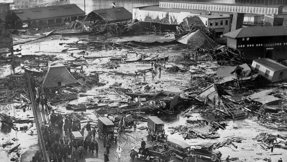 Molasses was a trade commodity. It was one of the major products that constituted the Triangle Trade of the 17-1800s. Molasses was a bi-product of sugar-making in the Caribbean, and was imported to New England in large amounts. How did they use all that molasses? Some of it went to livestock feed. Most went into making rum. A lot of molasses was used in food preparation — Boston Baked Beans, molasses cookies, molasses puff candy, poured on pancakes — molasses was a popular ingredient when sugar was expensive. By the time of World War I, molasses was used to manufacture some munitions, and also to make distilled alcohol, so there were storage tanks of molasses in a few places around Boston, Massachusetts. The largest of these was near Cobbs Hill in the North End, and it was owned by United States Industrial Alcohol. The company had been told that the tank was leaking, so they painted it brown to camoflague the fact. January 15, 1919 was unseasonably warm. The molasses and fermentation gasses expanded in the tank. And then it exploded. Near-by, buildings collapsed or were knocked off their foundations. Shrapnel in the form of half-inch rivets flew everywhere. The resultant implosion sucked a train off the tracks. Not done yet! When the tank ruptured, a 40-foot wall of molasses flowed down the streets at 35-mph. Twenty-one people died, 150 were injured, many horses and other animals were lost. The company blamed “Italian anarchists” and anything else they could think of — except their own neglect. The smell of molasses lingered for months. Building codes are stronger now in Massachusetts. Good thing.