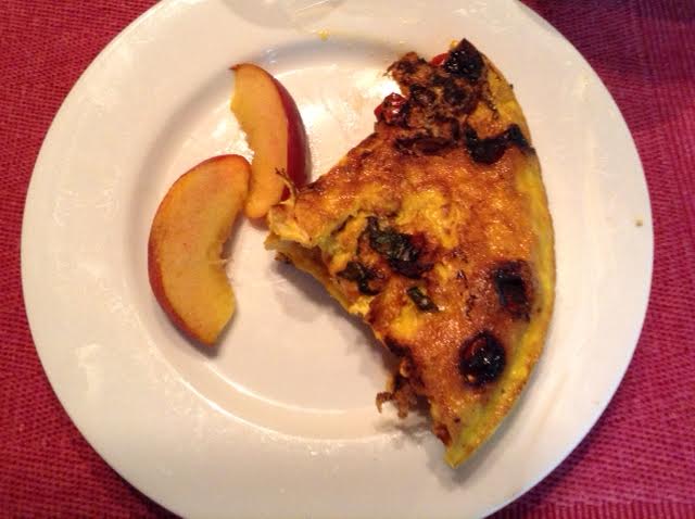 1½ two-oz eggs HINT: If you are serving one person, crack three 2-oz eggs into a small bowl or glass measuring cup. Whip up those eggs and pour half of their volume into a jar with a lid and put it in the ‘fridge for next week. 1 Tbsp white beans, preferable small ‘navy’ beans 2 Tbsp green part of scallions, sliced 1 oz tomato, diced and drained in a sieve overnight ¼ oz shrimp, preferably tiny Northern shrimp OR larger shrimp chopped 1½ oz nectarine Optional: blackish coffee [53 calories] or blackish tea or mocha cafe au lait [65 calories] Optional: 5 oz fruit smoothie or berry-yogurt smoothie [88 calories]