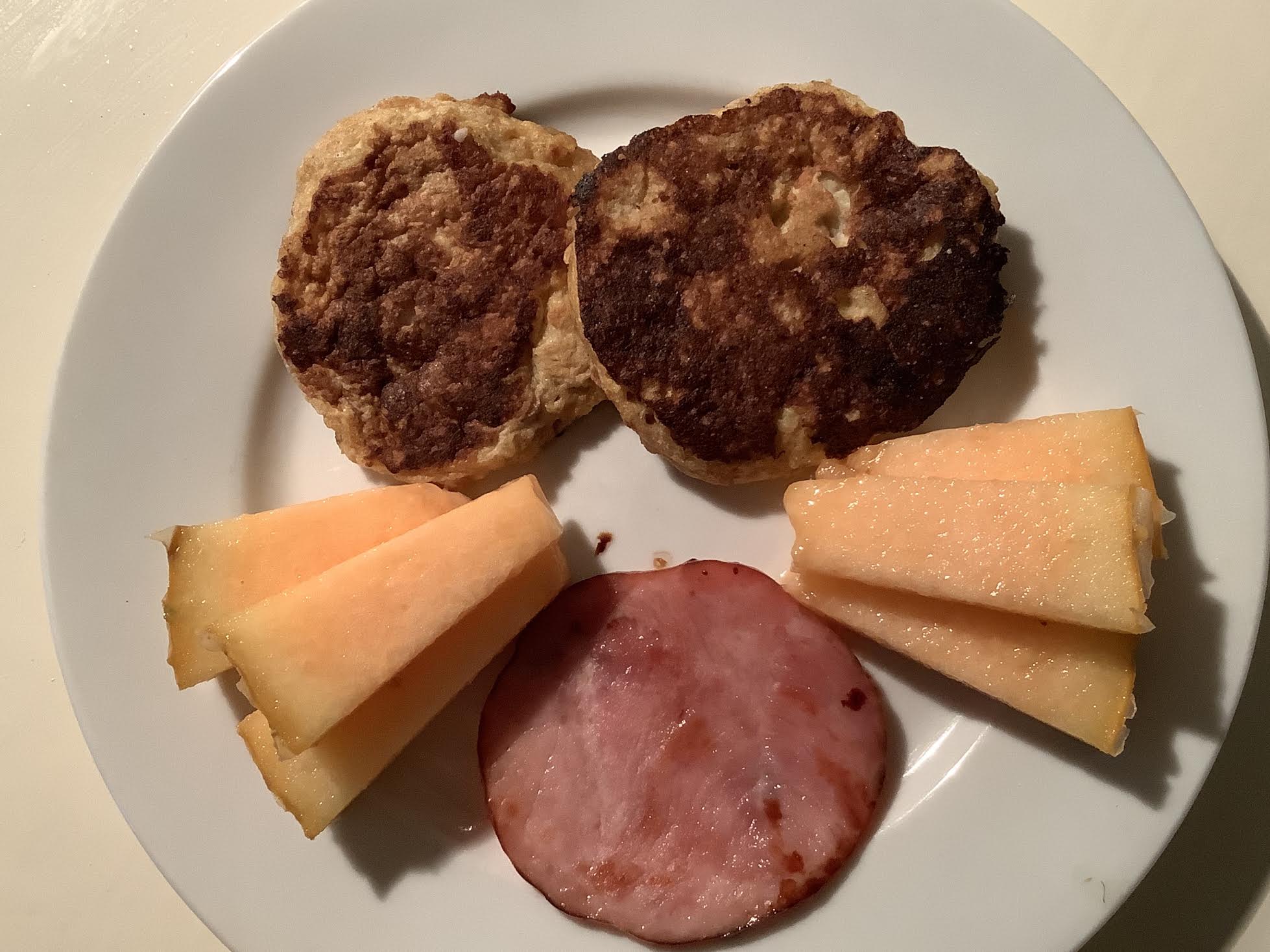 Cook the bacon, warm the pancakes, and plate with the melon. Perfect.