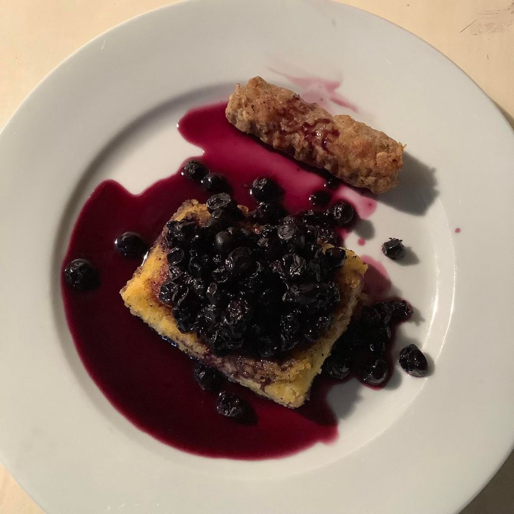 2 oz sliced polenta @ 43 calories** 1/3 cup blueberries, fresh or frozen 1 T. maple syrup 1 chicken breakfast sausage @ 40 calories Optional: 5 oz fruit smoothie or berry-yogurt smoothie [88 calories] Optional: blackish coffee [53 calories] or blackish tea or mocha cafe au lait [65 calories]