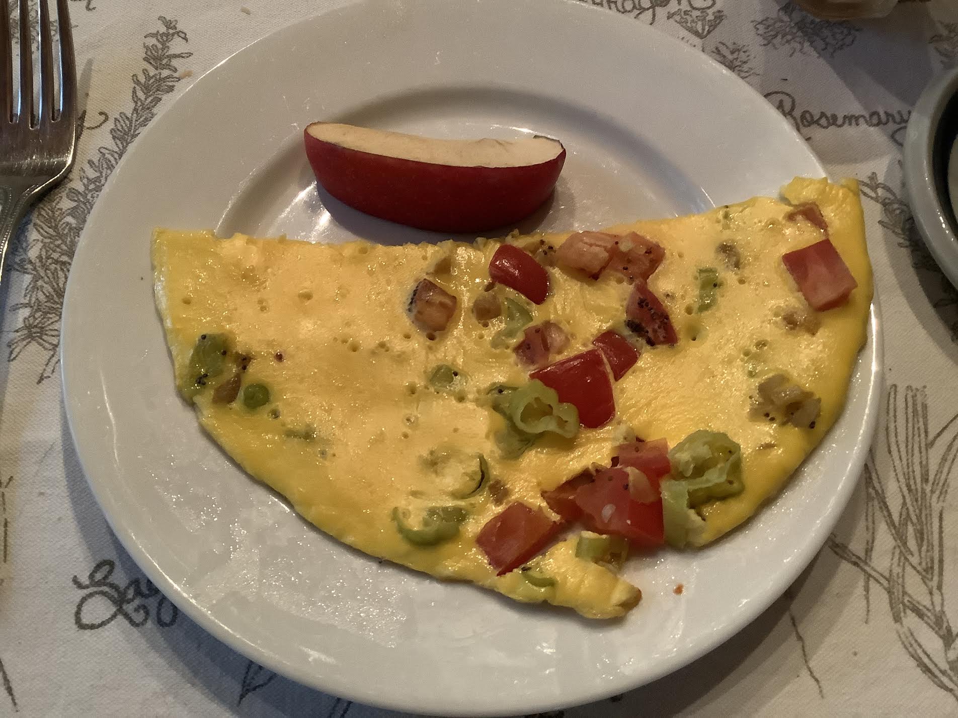‘Chicago’ ScrOmelette:  135 calories — 7 g fat — 2 g fiber — 10 g protein — 7 g carbs — 53.4 mg Calcium  NB: Food values shown are for the ScrOmelette and fruit only, and do not include the optional beverages.  PB GF  One of my methods for creating a new breakfast is to take flavor elements from a favorite dinner and then put them in eggs. Here, we have a ‘Chicago Hot Dog’ without the sausage and without the bun. Dear Husband deemed it ‘very good!’