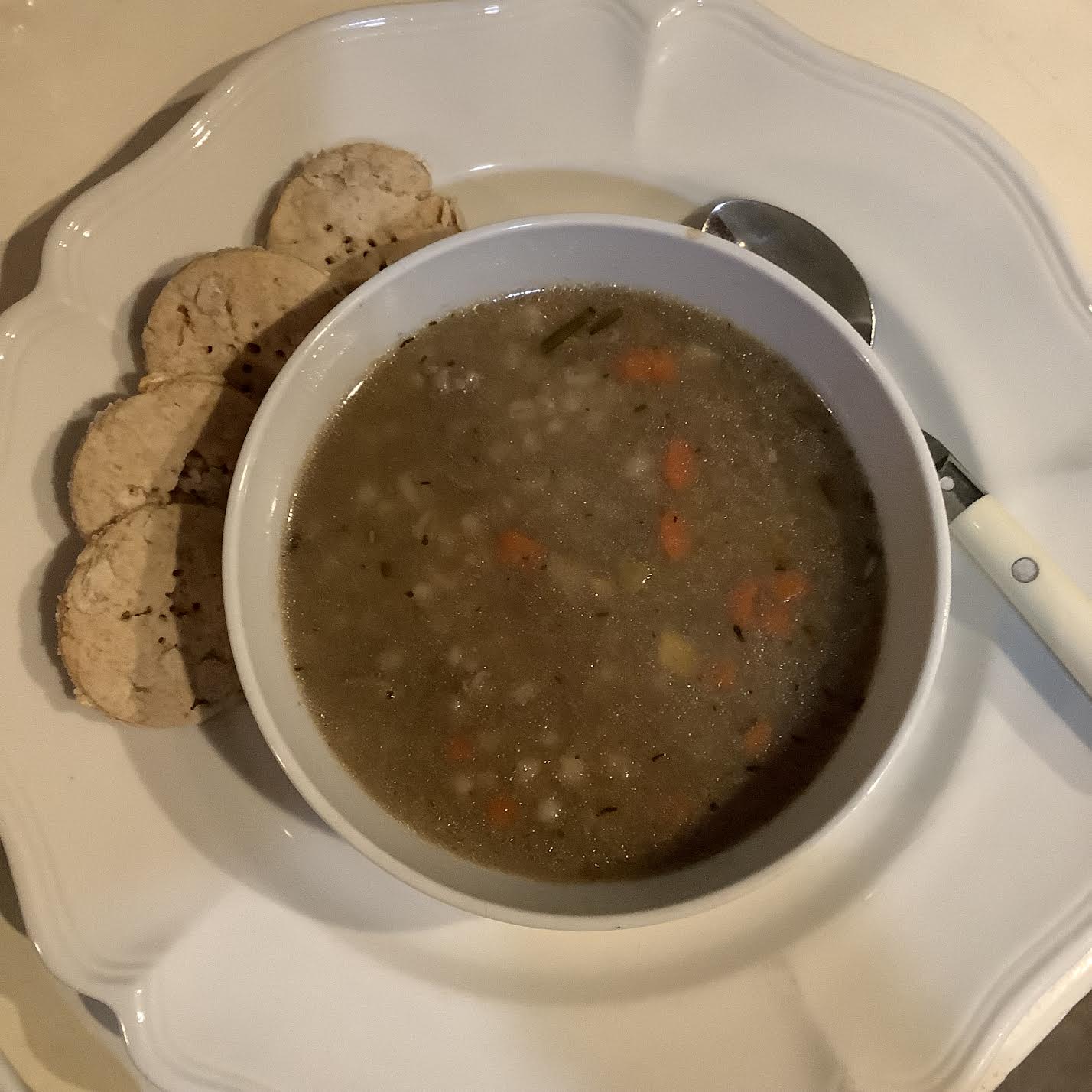 Scotch Broth: 140 calories —5 g fat —2 g fiber— 7 g protein— 16.4 g carbs— 21.4 mg Calcium   NB: food values are for the soup only.  PB  This is one of those ancient comfort foods. One can imagine generations of Scottish crofters making the best of local barley and root vegetables cooked with a bit of mutton. This soup is warm and hearty. HINT: the recipe produces 5 [five] one cup servings.