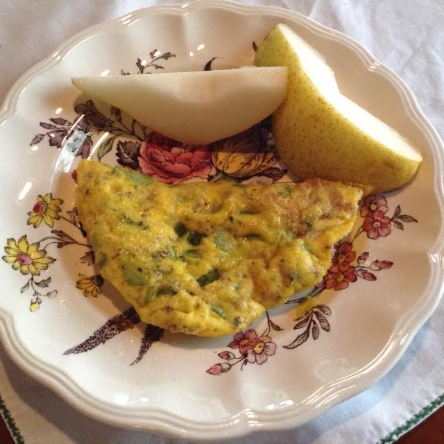 1 two-oz egg — 2 Tbsp [0.33 oz] thinly sliced, cooked asparagus — ½ Tbsp [0.2 oz] prosciutto, thinly sliced or diced — 1.5 tsp Parmesan cheese, grated — 1 oz pear Optional: 5 oz fruit smoothie or berry-yogurt smoothie [88 calories] —— Optional: blackish coffee [53 calories] or blackish tea or mocha cafe au lait [65 calories]