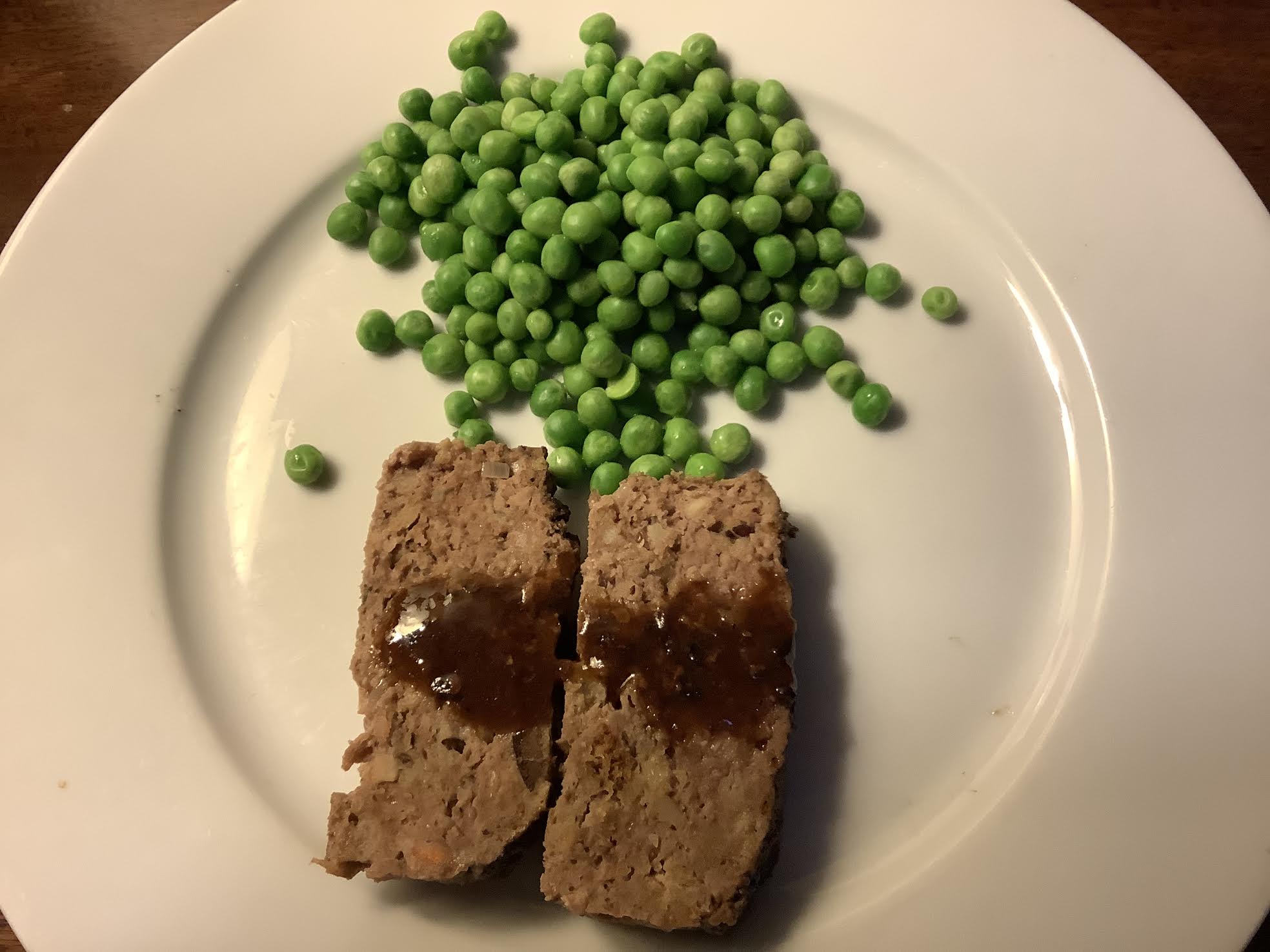 one 3-oz slice of meatloaf** ++++++ ½ cup peas +++++ 2 Tbsp beef gravy