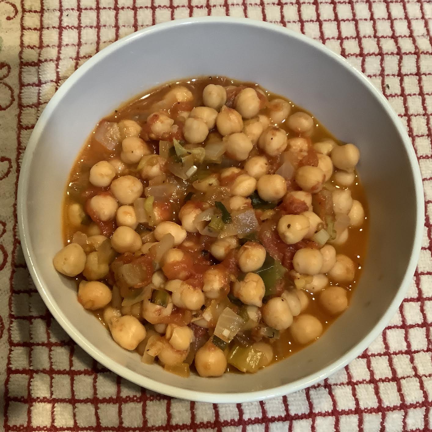 ++ ½ tsp olive oil ++++ ½ cup diced onions ++++ ½ cup scallions, chopped ++++ 1 Tbsp garlic ++++ 2 cups diced tomatoes, fresh or canned and drained ++++ 1½ cup chickpeas, drained and rinsed if canned ++++ ½ cup chicken stock ++++ ½ tsp salt ++++ ½ tsp pepper ++ Heat the oil in a saute pan. Add the onion, scallion and garlic. Stir briefly over the heat then add the tomatoes, chickpeas, stock, salt, and pepper. Cook over low heat until liquids are mostly evaporated. If using now, separate out your portion and keep warm. Cool the remaining ragout and freeze it in serving portions. This is from Jacques Pepin’s Fast Food My Way