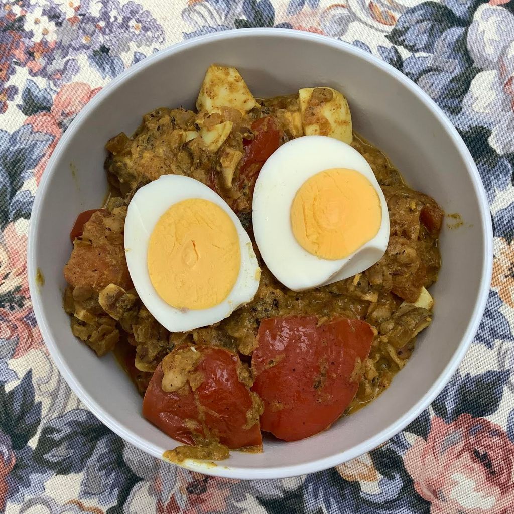 | 2 hard-boiled eggs, peeled and halved | Nestle egg halves on top of the curry mixture. |