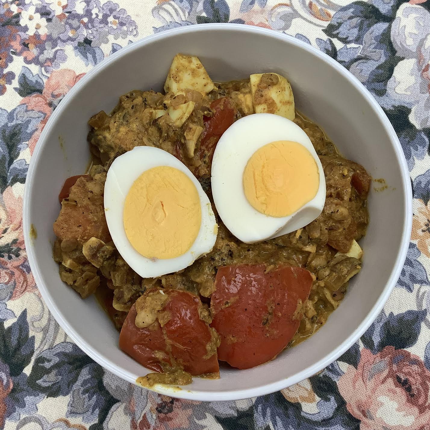 | 2 hard-boiled eggs, peeled and halved | Nestle egg halves on top of the curry mixture. |
