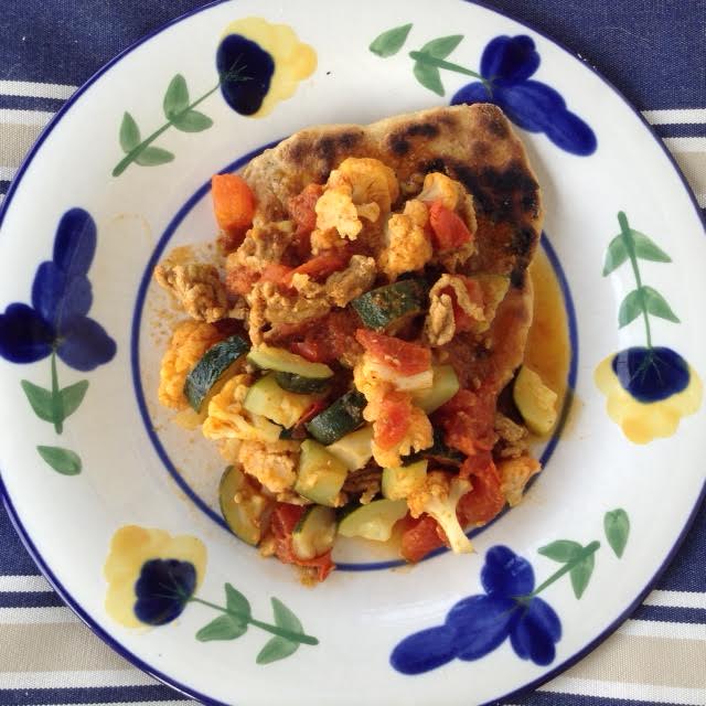 ++ 1 naan flatbread, 106 or fewer calories/piece ++++ 3 Tbsp Rogan Josh Sauce ++++ ½ cup zucchini, in ½” dice ++++ ½ cup cauliflower, in ½” pieces ++++ ½ cup tomato, in ½” dice ++++ 2 oz ground turkey [I used 15% fat but would have prefered less fat] ++++ ¼ tsp Indian curry powder ++