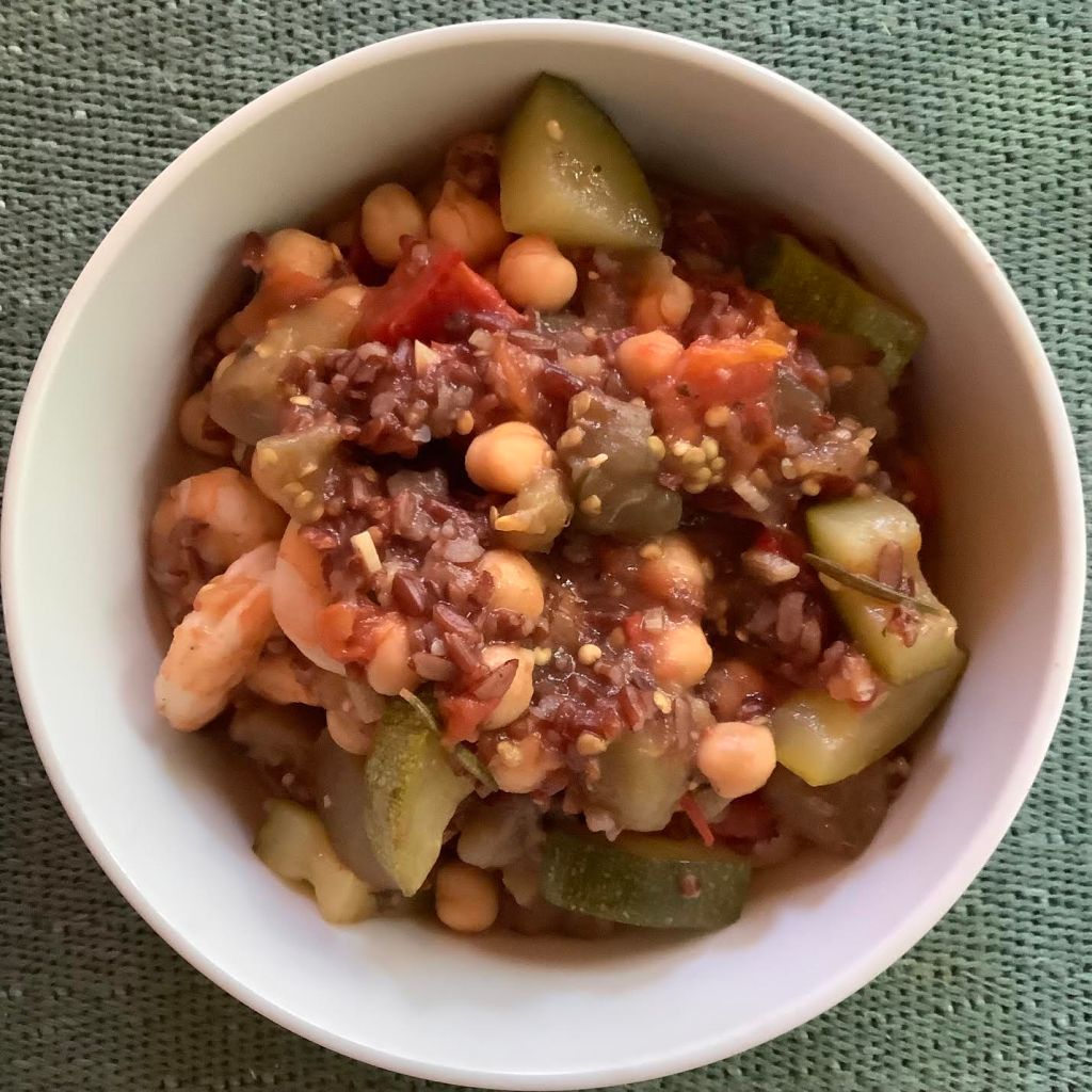 Camargue Bowl: 288 calories… 4 g fat… 10 g fiber… 23.5 g protein… 29 g carbs… 98.5 mg Calcium… PB GF This meal is all about the flavors and products of the central Mediterranean coast of France, the Rhone Delta: vegetables from the sunny gardens, garbanzo beans [introduced by the Berbers], shrimp from the shallows, and Camargue rice from the marshes. HINT: This recipe serves 2 [two] and it is worth making the whole thing.