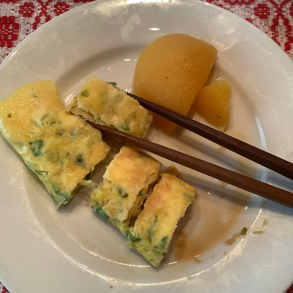 Spritz a non-stick pan with non-stick spray. Cook the crab and leek until you can smell the leek, but don’t brown it. Remove from pan. Beat the egg with sugar, and divide into 2 parts. Spritz the pan again and reheat. Put half of the egg in the pan and swirl/tip the pan to spread it out into a rough round. Distribute the crab and leek all over the egg. When top of egg is set enough that it is still moist but won’t jiggle much, roll the egg into a roll from one side of the pan to the other and leave it there. Pour the remaining egg in the pan and cook until almost set. Roll the roll across the pan again to incorporate the newly-cooked egg. Plate and serve with soy sauce. Prepare the beverages and fruit and enjoy your meal from Japan.