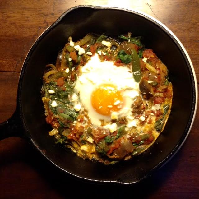Use a small cast iron or other skillet that has a lid. Cook the onion and celery in the oil until a bit softened. Add the garlic and cook 30 seconds. Add the sweet pepper, tomato, and eggplant, along with the seasonings, and cook until tender. Put the spinach in the bubbling vegetables and stir/toss until leaves are softened but not limp. Turn down the heat. Make a slight indentation in the vegetables and crack an egg into it. Sprinkle with the Feta. Cover the skillet and cook for 8 minutes. Check to see if egg is done to your liking. If not, cover again and cook another minute or two. Serve in the skillet. NB: You could cook two eggs on top for one person if you wanted to boost the protein. 290 calories / 15 g fat / 5 g fiber / 18 g protein / 17 g carbs / 235 mg Calcium