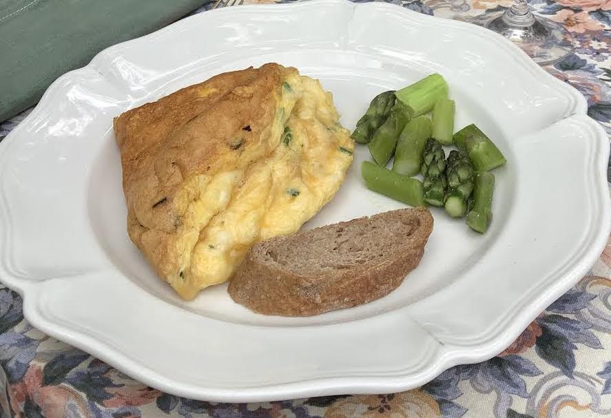 Our meals today are full of air. Whipping egg whites until they stand up in peaks is one of the marvels of culinary processes. Both of our meals employ eggs, so I wouldn’t recommend preparing them for breakfast and dinner on the same day, since one or two eggs per day is considered to be enough. They are delicious, whether at breakfast or at dinner.