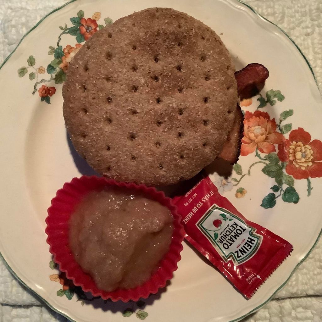 ++ 1 Arnold whole-wheat Sandwich Thin, top and bottom ++++ 2 slices uncured American bacon, cut in half ++++ 2 oz applesauce ++++ 1 packet ketchup, for authenticity ++++ Optional: blackish coffee [53 calories] or blackish tea or mocha cafe au lait [65 calories] ++