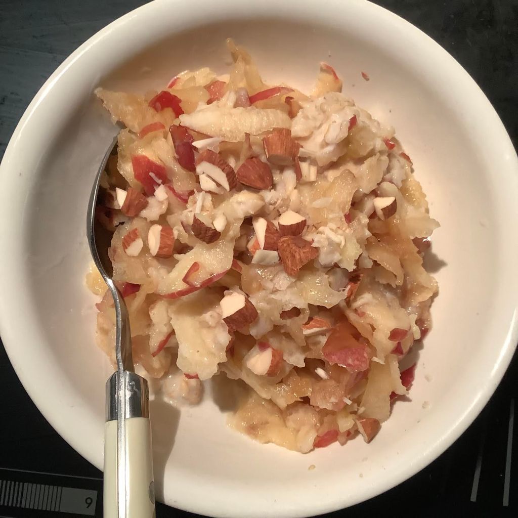 | 5 oz apple, with skin on ++++ 2 tsp lemon juice | Grate the apple and mix with lemon juice, then add to the oat mixture. Stir to combine. |