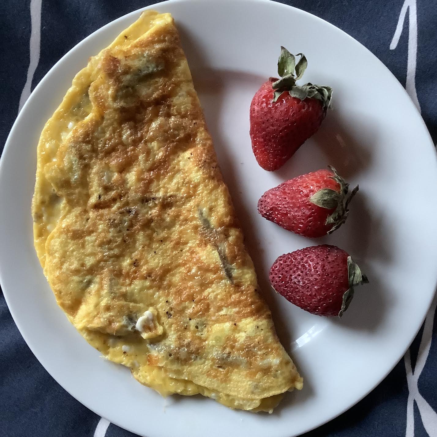 The night before: put the fish into 1 cup+ water, and soak 30 minutes. Drain, cover with water, and soak overnight.  Next morning: Drain fish, blot dry, mince. Whisk the cheese and garlic into the egg, then stir in the fish. Pour into an oil-wiped non-stick pan over medium-high heat, and cook until the bottom is set and the top is cooked to your taste. Fold and plate with the fruit.