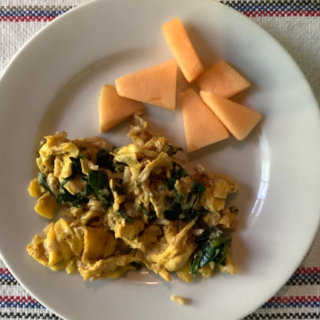 ++ 1½ two-oz eggs HINT: If you are serving one person, crack three 2-oz eggs into a small bowl or glass measuring cup. Whip up those eggs and pour half of their volume into a jar with a lid and put it in the ‘fridge for next week ++++ ½ cup dandelion greens ++++ 1 clove garlic ++++ 1 Tbsp cooked brown rice ++++ 1 oz melon ++++ Optional: blackish coffee [53 calories] or blackish tea or mocha cafe au lait [65 calories] ++++ Optional: 5 oz fruit smoothie or berry-yogurt smoothie [88 calories] ++