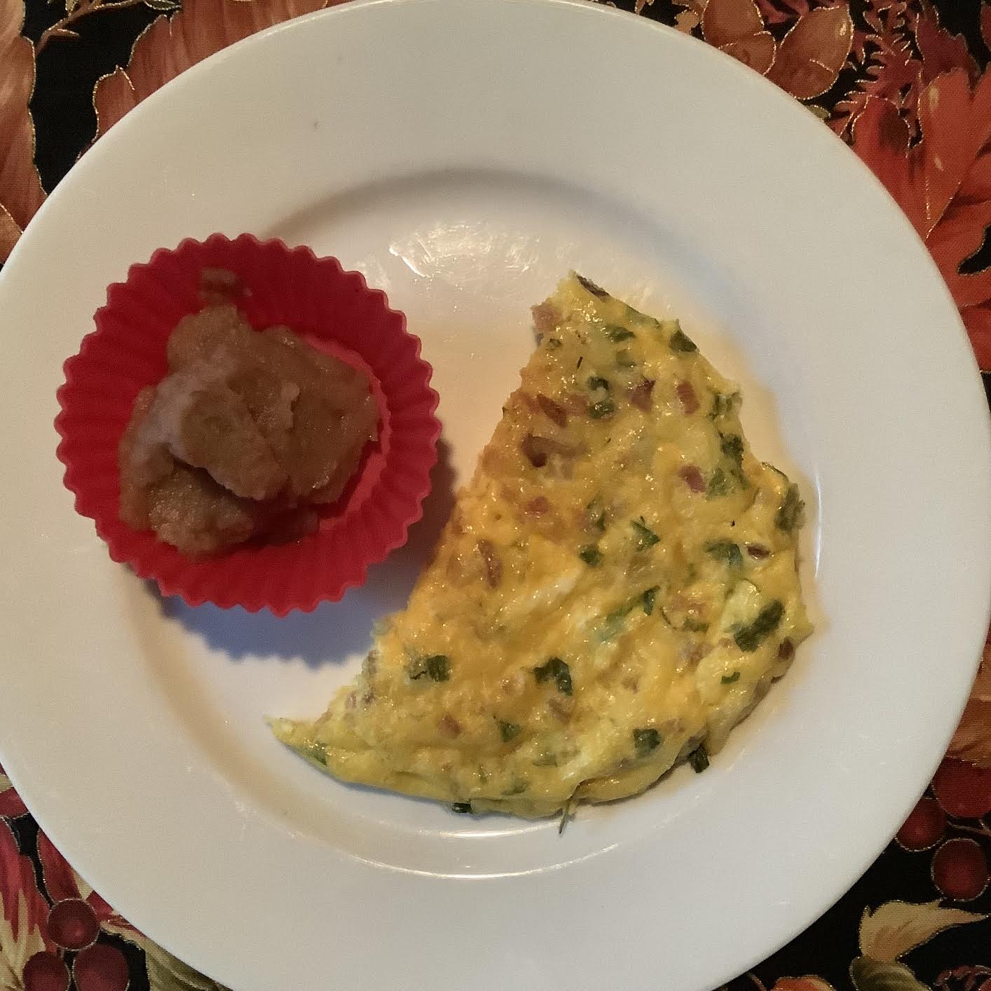++ One 2-oz egg ++++ 3 scant Tbsp Jarlsberg cheese, grated ++++ 1/3 oz 3% fat ham [from deli], diced ++++ dried sage, salt, and pepper to taste ++++1 oz applesauce OR 2 oz strawberries, whole or sliced, fresh or frozen ++++ Optional: 5 oz fruit smoothie or berry-yogurt smoothie [88 calories] ++++ Optional: blackish coffee [53 calories] or blackish tea or mocha cafe au lait [65 calories] ++