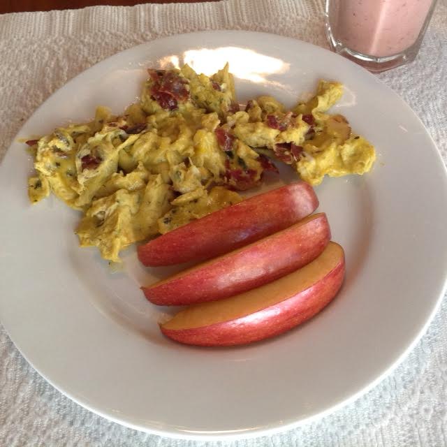 ++ 1½ two-oz eggs HINT: If you are serving one person, crack three 2-oz eggs into a small bowl or glass measuring cup. Whip up those eggs and pour half of their volume into a jar with a lid and put it in the ‘fridge for next week. ++++ 1/3 oz uncured capicola ham, sliced thinly and chopped ++++ large pinch oregano ++++ 1.7 oz apple ++++ Optional: blackish coffee [53 calories] or blackish tea or mocha cafe au lait [65 calories] ++++ Optional: 5 oz fruit smoothie or berry-yogurt smoothie [88 calories] ++