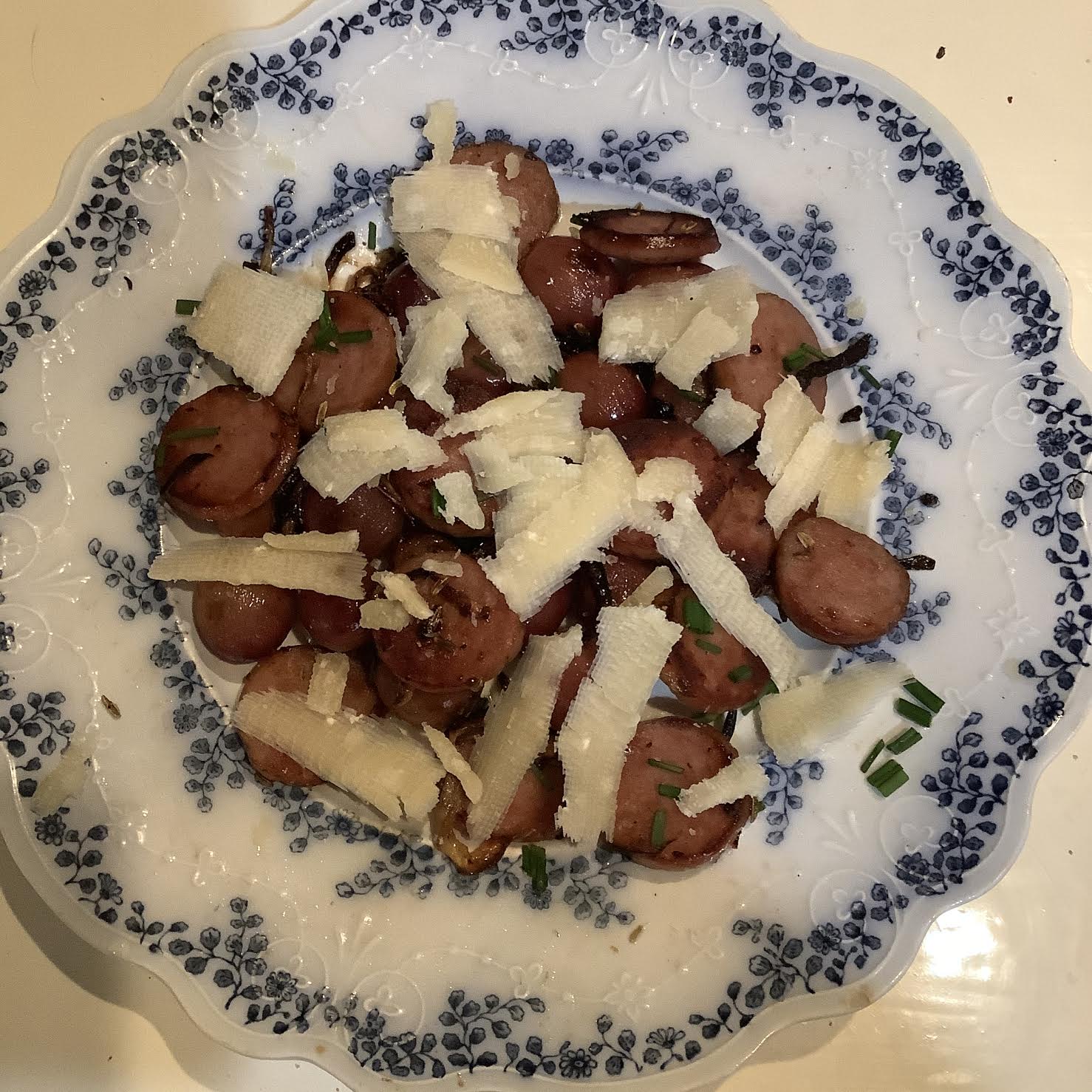 Roasted Grapes & Sausage: 269 calories… 14 g fat… 2 g fiber… 10 g protein… 30 g carbs… 65 mg Calcium… PB GF This is a remarkable combination of flavors! HINT: This recpe serves two [2]. It comes together very quickly for a delicious meal. The recipe is from Melissa Clark of the New York Times.