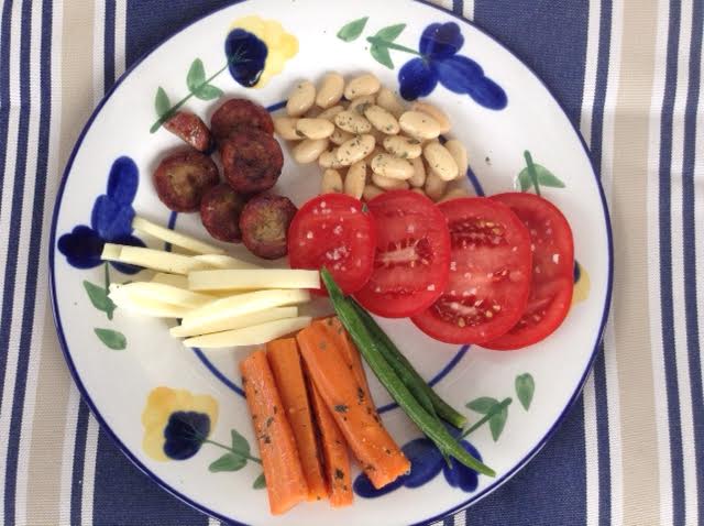 +++ ¼ cup white beans + ½ Tbsp capers ++++ ½ oz marinated mushrooms +++ 2½ oz tomato, cubed or sliced and sprinkled with sea salt + a generous pinch Greek oregano ++++ 1¼ oz cooked chicken breast -OR- 1½ oz sliced Loukanico [Greek lamb sausage]++++ 1 oz mozzerella cheese -OR- feta cheese ++++ 1½ oz lemon-marinated carrots ++++ marinade: 1 tsp olive oil + 1 tsp lemon juice + pinch of granulated garlic + pinch oregano