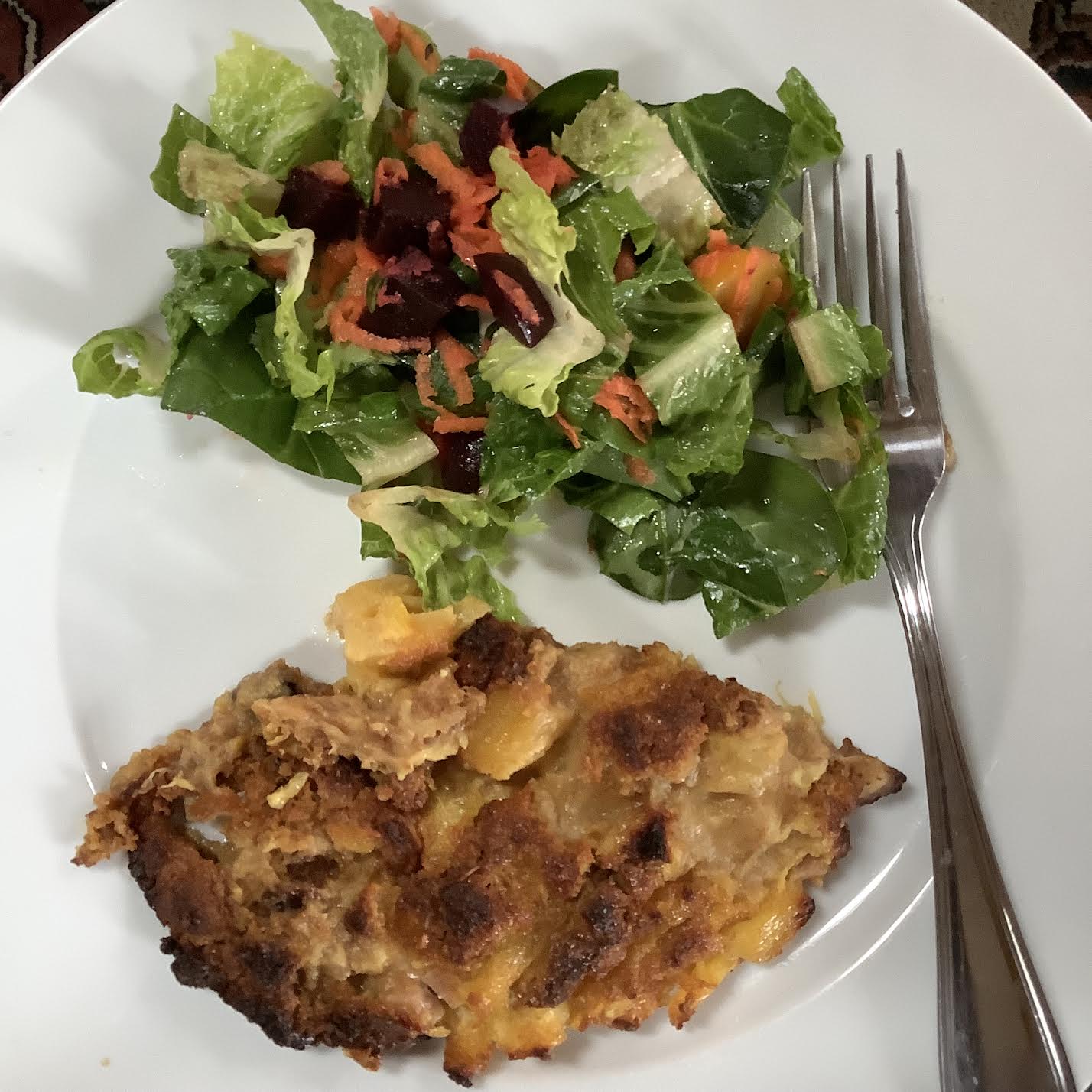 Cream butter and sugar together, then whisk in the eggs. Add bread cubes to the bowl and stir together to combine. Add the ham and drained pineapple. Stir to combine thoroughly. The batter should be moist, so if it is too dry, you may add some of the drained pineapple juice to bring it to the right consistancy. Spray a 6×10” baking pan with non-stick spray and pour in the batter. Smooth it into the corners and bake at 350F for 25 mins, until set and starting to brown on the top. Cut into 6 pieces. Serve with the Side Salad. Freeze the pieces that you don’t use today for another meal.