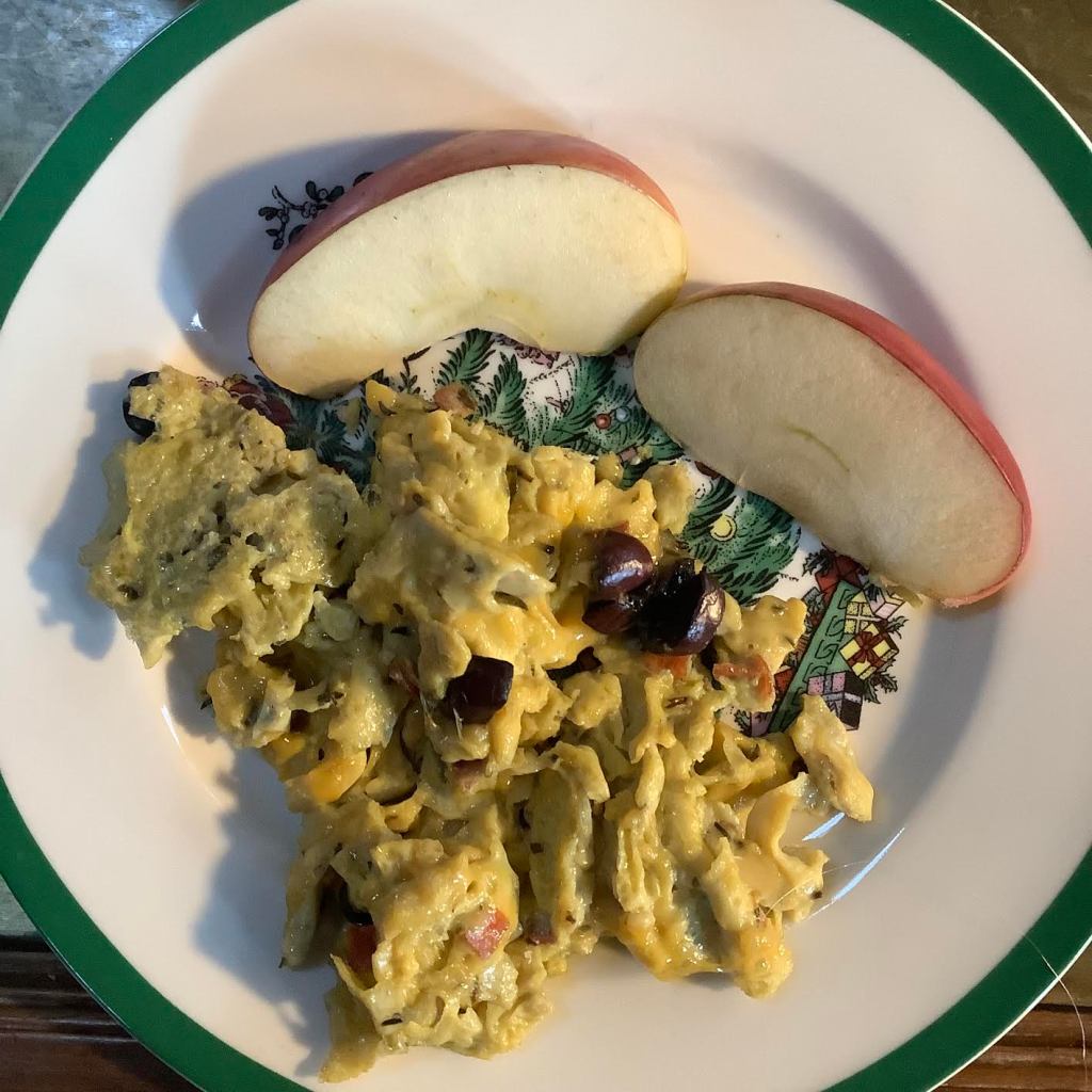 ++1½ two-oz eggs HINT: If you are serving one person, crack three 2-oz eggs into a small bowl or glass measuring cup. Whip up those eggs and pour half of their volume into a jar with a lid and put it in the ‘fridge for next week. ++++ 1 slice pepperoni [ 2” diameter], chopped ++++ 1 Kalamata olive, chopped ++++ large pinch of Winter Savory ++++ salt + pepper ++++ 2 oz pear ++++ Optional: blackish coffee [53 calories] or blackish tea or mocha cafe au lait [65 calories] ++++ Optional: 5 oz fruit smoothie or berry-yogurt smoothie [88 calories] ++