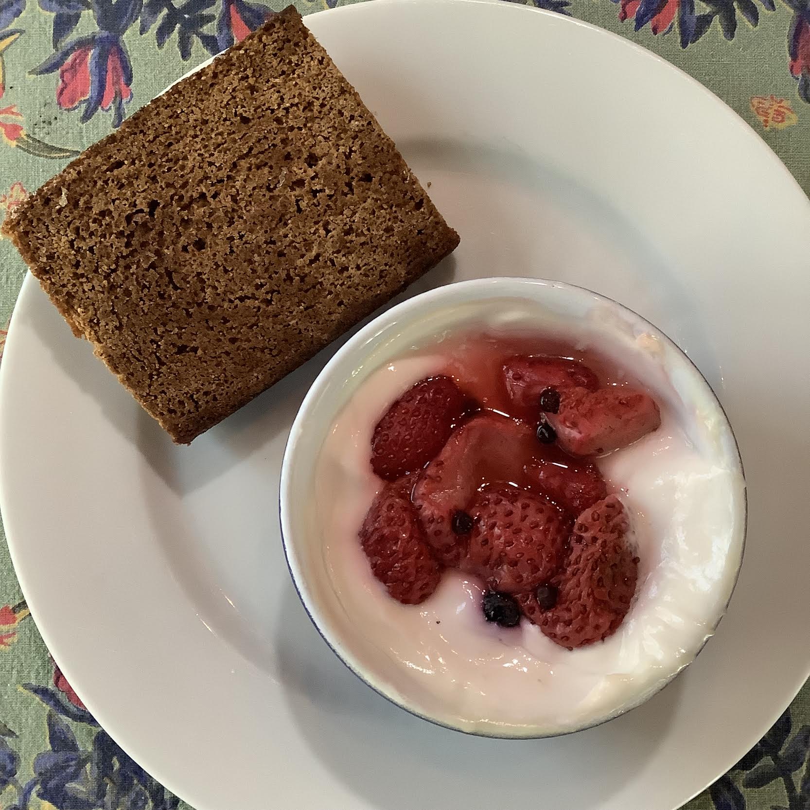++ 2 oz Boston Brown Bread, without raisins, purchased or homemade ++++ ½ c plain Greek-style yogurt, 5% fat ++++ 1 oz strawberries ++++ Optional: blackish coffee [53 calories] or blackish tea or herbal tea ++