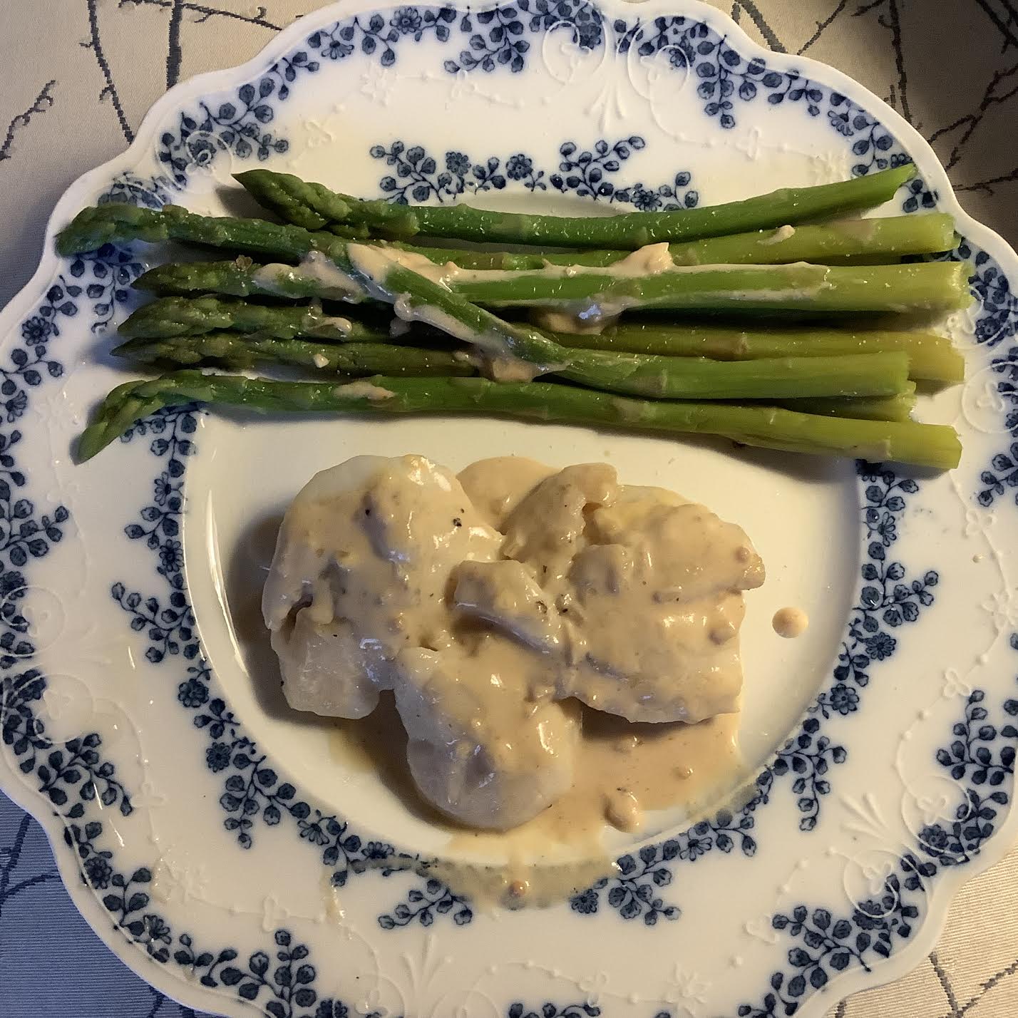 Cod Cheeks in Cream Sauce: 227 calories… 12 g fat… 2 g fiber… 24.6 g protein… 6 g carbs… 66 mg Calcium…  PB GF  The cheeks of cod and halibut are considered a delicacy among fisherfolk, but skate cheeks will do as well. This simple recipe is SO delicious and very special.