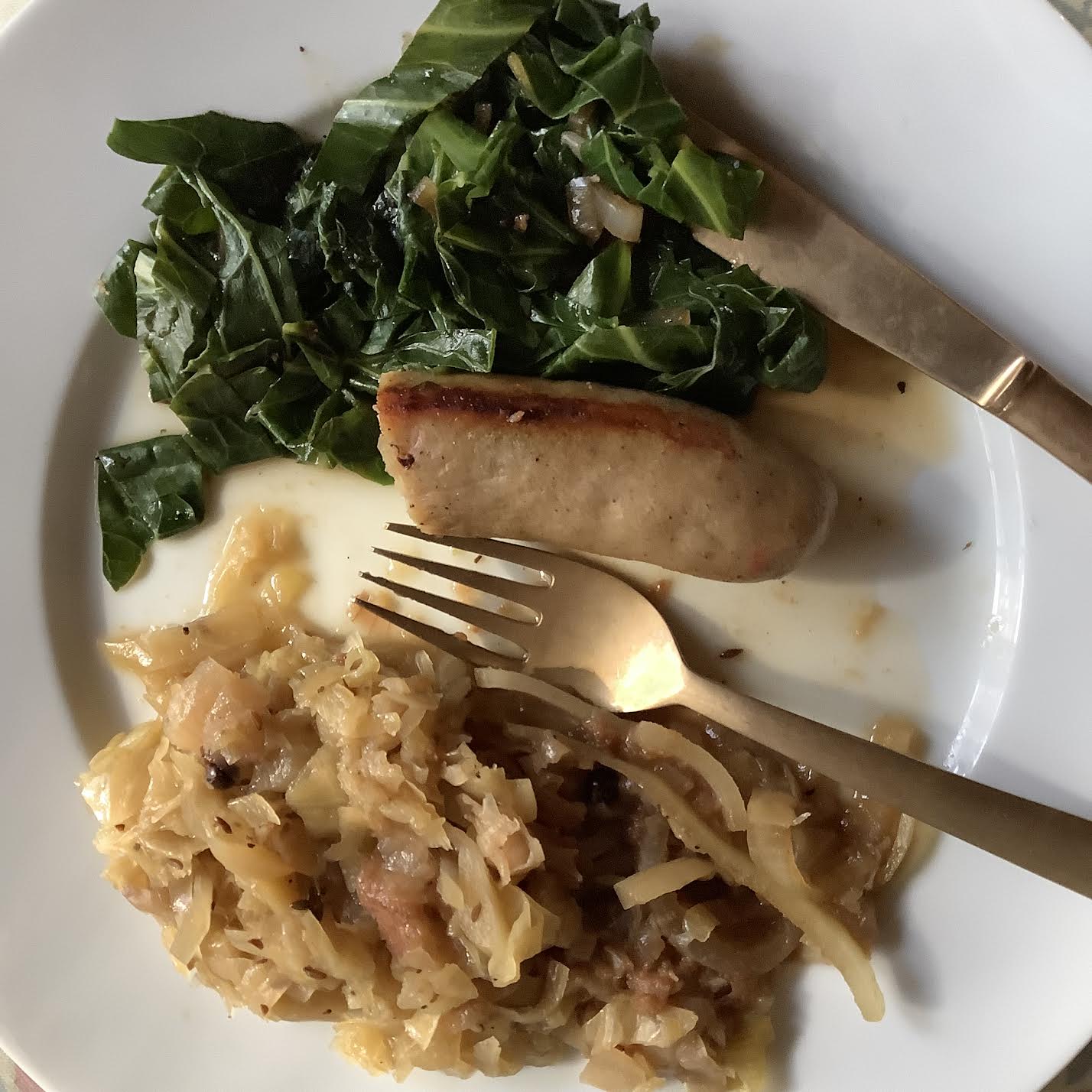 Thaw the sausage if it is frozen. Combine the sauerkraut, caraway seed, applesauce, and onions in a saucepan large enough to hold the sausage [if leaving whole]. Cook slowly, uncovered until half of the liquid is gone. Add the sausage, cover, and continue to cook until everything is hot. Meanwhile, put the collards into ½ cup water with seasonings, and cook covered until the greens are tender, about 10 minutes.