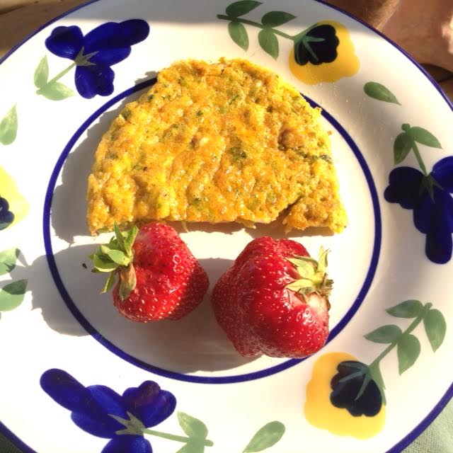 Korma-Broccoli Bake: 165 calories… 9 g fat … 3.4 g fiber… 9 g protein… 13 g carbs… 71.5 mg Calcium…  NB: The food values given above are for the plated foods only, not the optional beveragesPG GF  The combination of curry and vegetables is terrific in eggs. See if you agree. Nothing blue about this breakfast!