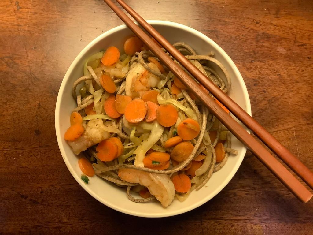 ++ 1 oz of dry udon [or soba] noodles ++++ 3 oz raw shrimp, cut in half                                                                   across the body ++++ 2 oz carrot, peeled and sliced into coins ++++                                                 1½ oz green cabbage   ++++ 1 oz onion ++++ 1½ tsp soy sauce                                                            ++++ 1 tsp olive oil ++++ 1 oz chopped green onion ++